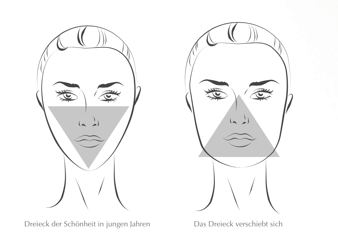 Das Dreieck der Schönheit, dessen Schwerpunkt sich in jungen Jahren in der oberen Gesichtspartie befindet, wandert im Laufe der Zeit in den unteren Gesichtsbereich. Die ursprünglichen Proportionen verschieben sich, das Gewebe sackt ab, es entstehen erste Fältchen und die Haut verliert an Elastizität. Zusätzlich verändert sich die Stützstruktur der Haut: Das Bindegewebe wird dünner, kollagene und elastane Strukturen beginnen auseinander zu brechen.